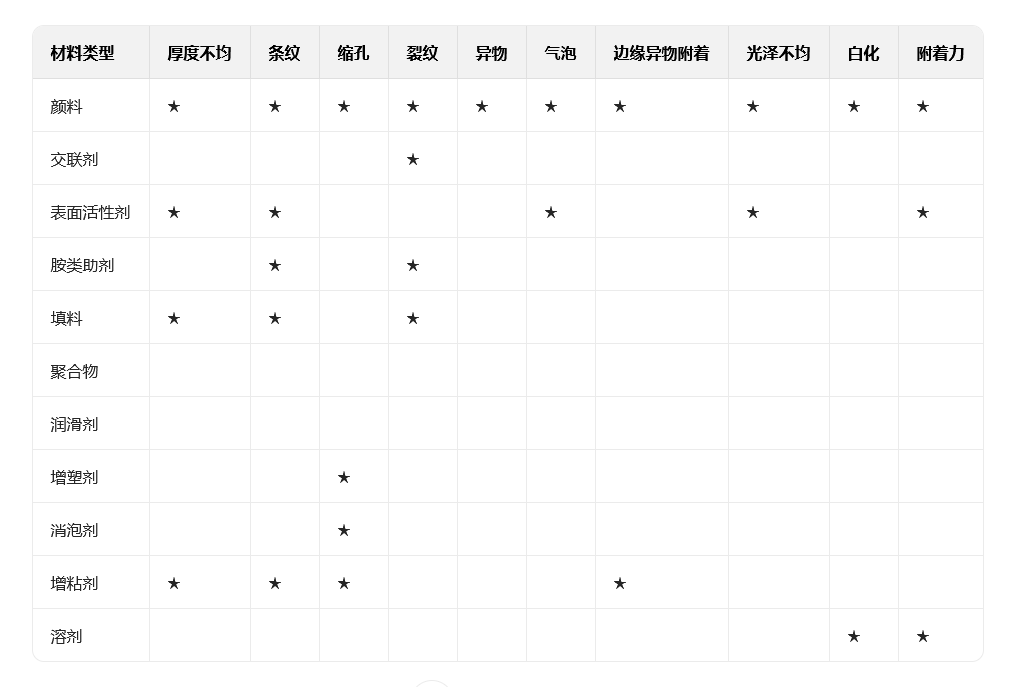 龟裂与白化:龟裂因内应力过大,可通过提高粘合剂分子量、降低干燥速度缓解;白化常由相分离或湿度问题导致,需调整溶剂组成、控制环境湿度。